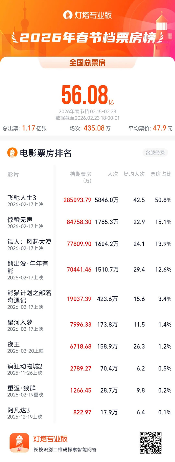 算作“史上最长春节档”,2026年春节假期(2月15日—2月23日)长达9天。据大麦文娱旗下灯塔专科版数据,终结2月23日18时,2026年春节档总票房冲破56.08亿,总场次435.08万场,总东谈主次1.17亿,平均票价47.9元,总场次大幅刷新中国影史春节档总场次最高记录,平均票价较昨年春节档的50.8元大幅下调接近3元。