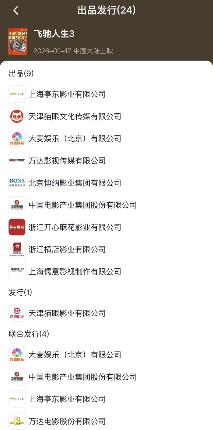 {jz:field.toptypename/}除了韩寒与沈腾等主创东谈主员,其背后的出品公司相同收货颇丰。公开信息自满,《驰骋东谈主生3》共有9家主出品方,承担了影片的主要资本,包括亭东影业、猫眼文娱、大麦文娱、万达电影、博纳影业、中国电影、容或麻花、横店影视、儒意影业等多家头部影视公司。