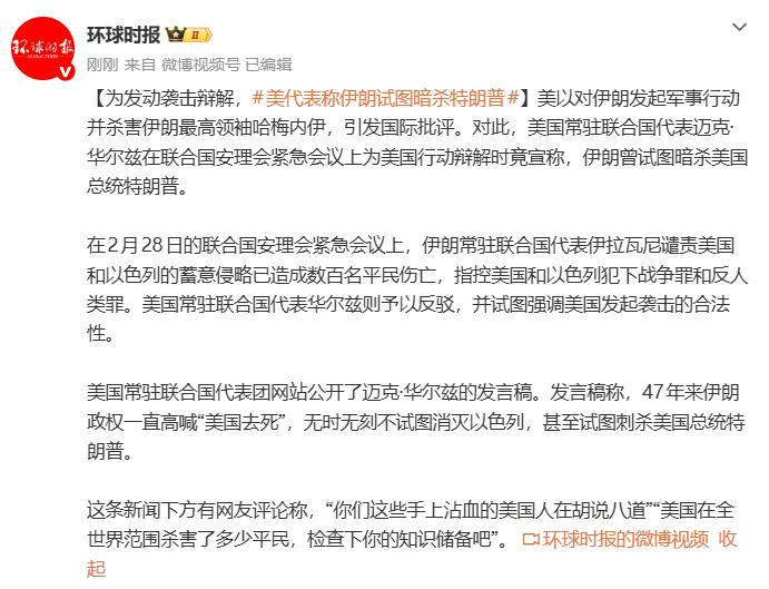 据寰球时报:好意思以对伊朗发起军事行径并杀害伊朗最高魁首哈梅内伊,激发海外品评。对此, 好意思国常驻伙同国代表迈克·华尔兹在伙同国安迎接弥留会议上为好意思国行径辩解时竟声称,伊朗曾试图暗杀好意思国总统特朗普。