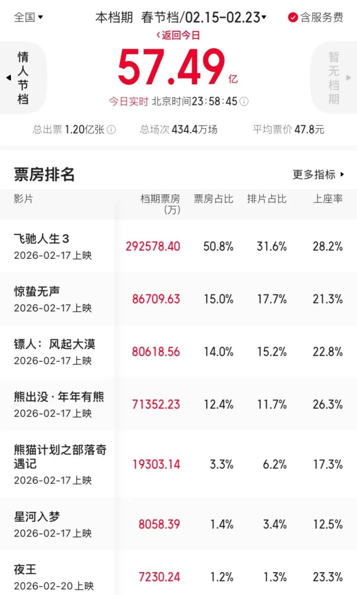 2月23日晚,长达9天的2026春节档以57.49亿票房圆满收官,从上映第一天就强势领跑的《奔突东说念主生3》毫无悬念地成为档期票房冠军,票房占比更是高达50.8%,拿下了春节档的“半壁山河”;《惊蛰无声》《镖东说念主》分列亚军和季军。