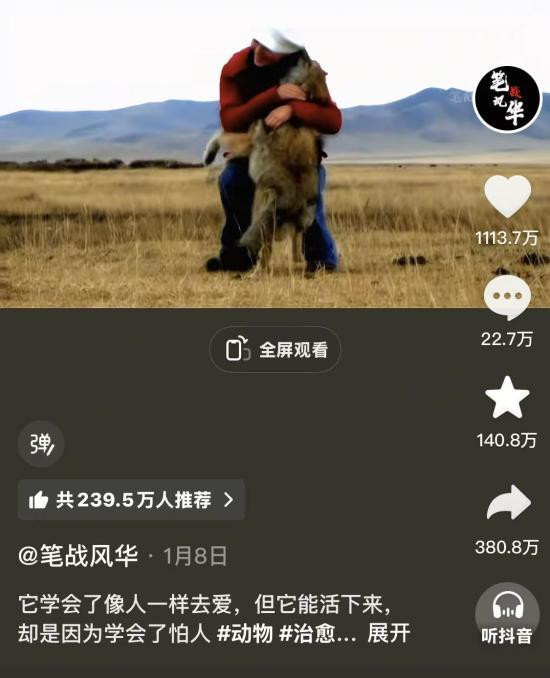 对于《重返·狼群》来说,“翻红”重映是一场偶然。1月初,博主“笔战风华”在抖音发布了影片二十分钟的讲明视频。视频源流,李微漪无意堕入冰窟受伤,小狼“格林”牵来一匹马送到她的身边。令东谈主惊怖的情节和精湛的旁白配音让这条视频播放量飞速破亿。现在,该视频在抖音点赞量已超1113万,驳倒数超22万,在小红书、微博等外交平台上掀翻热议。与此同期,很多短视频博主借由这股热度,将记录片拆解为“格林”牵马、隔山对望告别、“格林”璧还李微漪救子红腰带等1—3分钟的段落切片,并提真金不怕火“‘格林’身上莫得一个兜,却把姆妈的红腰带崇敬了七年”“全草原独一会拆大白兔奶糖的狼”等催泪环节句手脚讲明词,赚足不雅众目力。