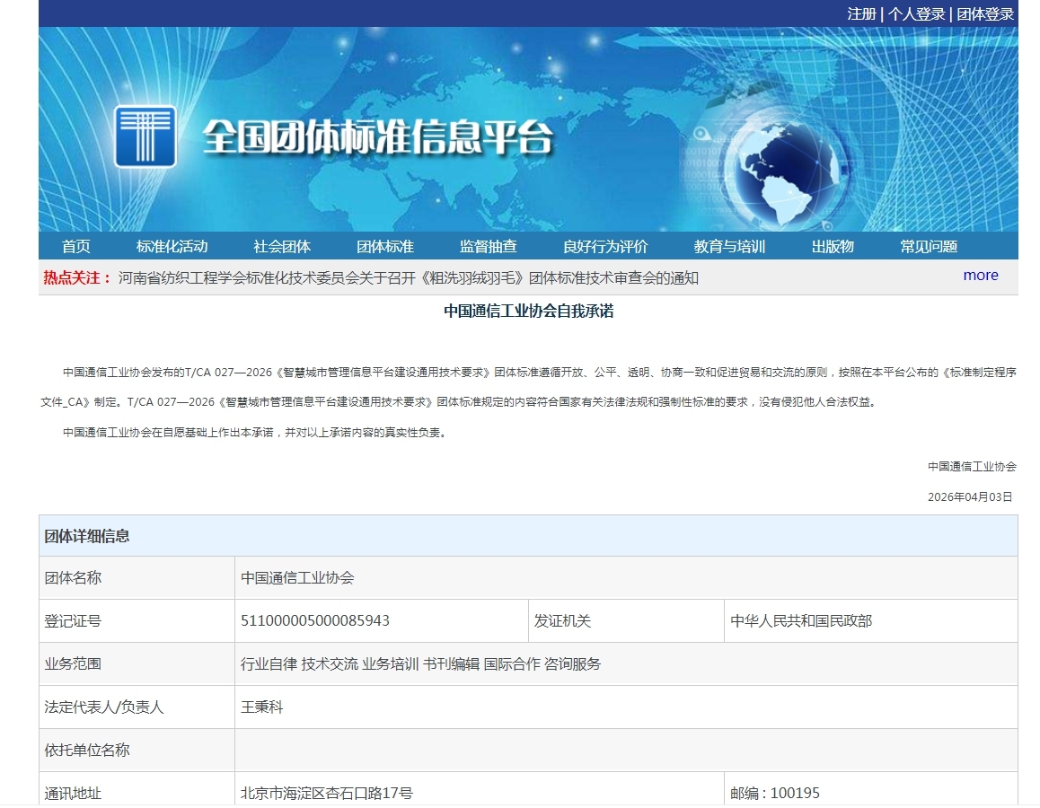 据悉,中国通讯工业协会是我国通讯工业鸿沟跨部门、跨地区、跨悉数制的寰宇性行业组织和非谋利性社会经济团体。中国普天信息产业集团、华为工夫有限公司、中兴通讯、大唐电信等国内大型通讯工业企业齐是协会的遑急成员。寰宇团体轨范信息平台是国度市集监督管制总局国度轨范化管制委员会诞生的团体轨范信息全球服务平台。